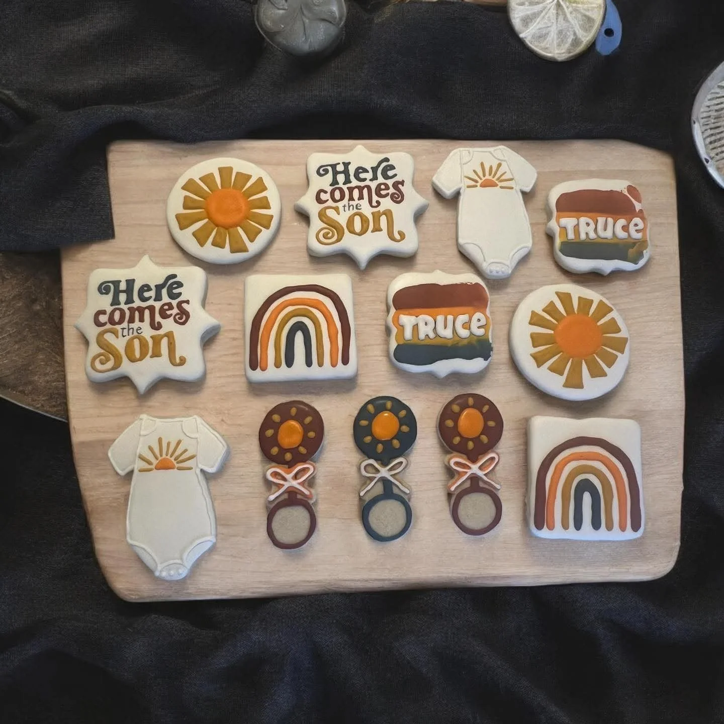 Fully hand-decorated cookies featuring detailed piping, layered designs, custom shapes, and intricate lettering.